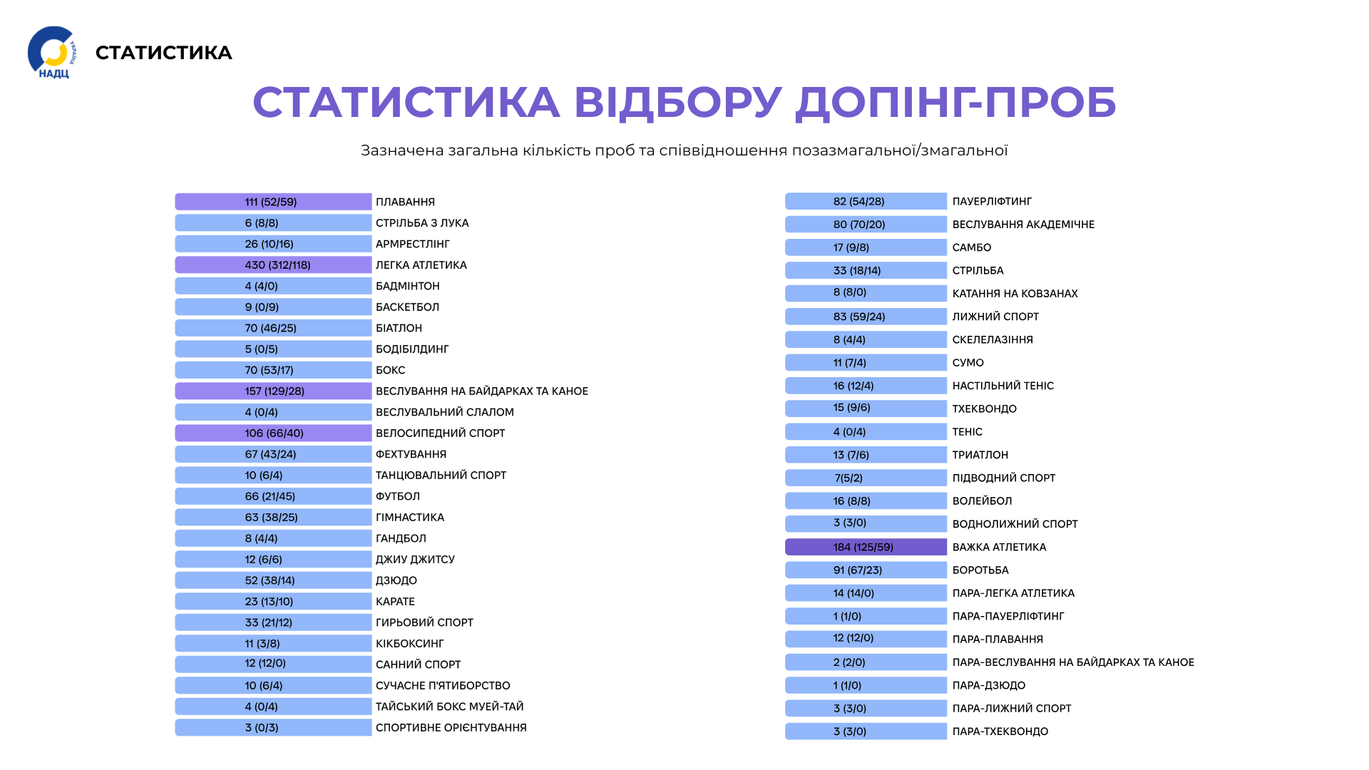 Within the NADC Statistics section, aggregated data on doping control sample collection carried out as part of the National Anti-Doping Center’s anti-doping programme are published.