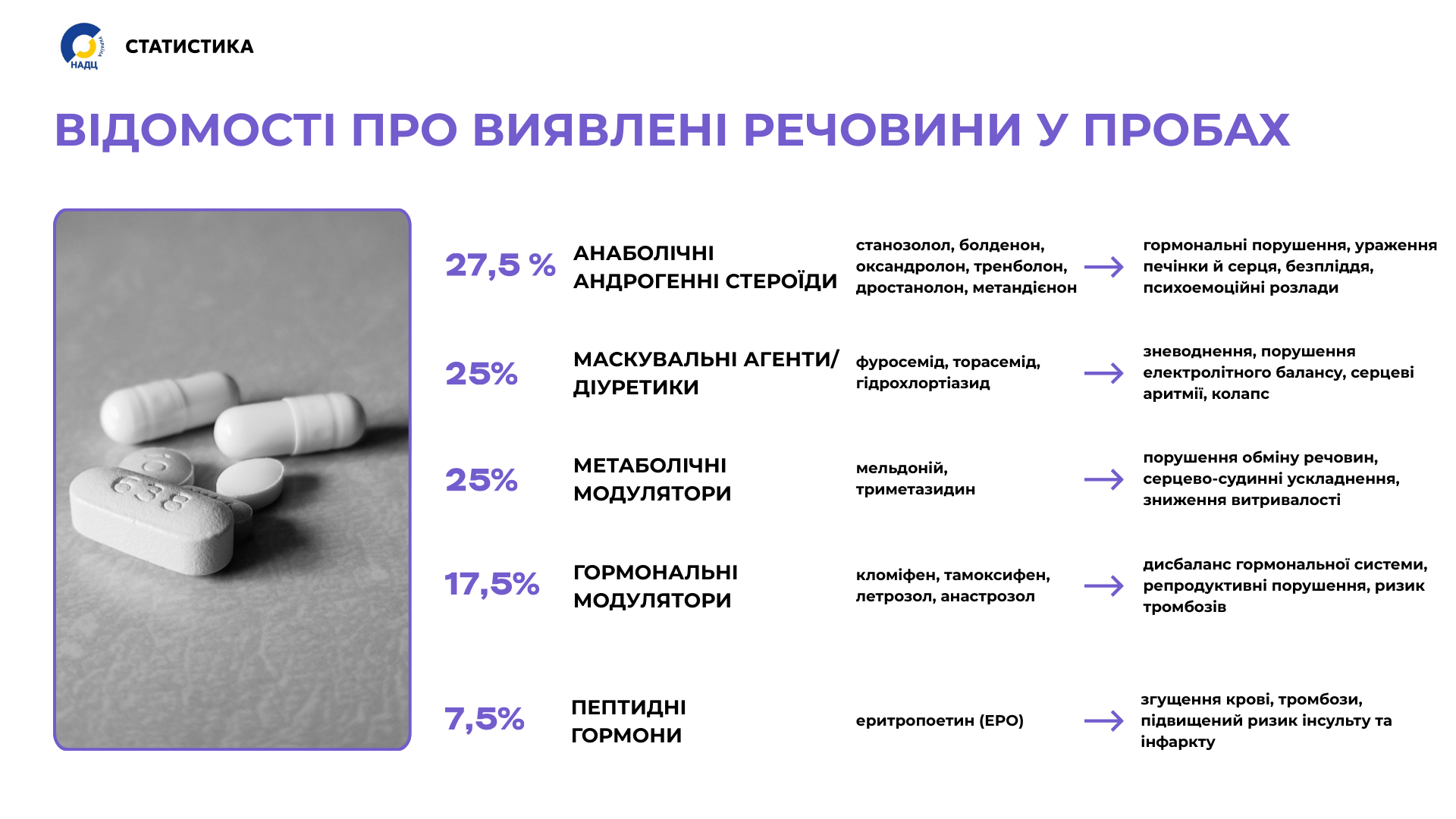The first topic focuses on the most common categories of prohibited substances detected in doping samples from Ukrainian athletes. The infographic illustrates the distribution by categories of the WADA Prohibited List, provides examples of substances, and outlines the general consequences of their use without therapeutic necessity.