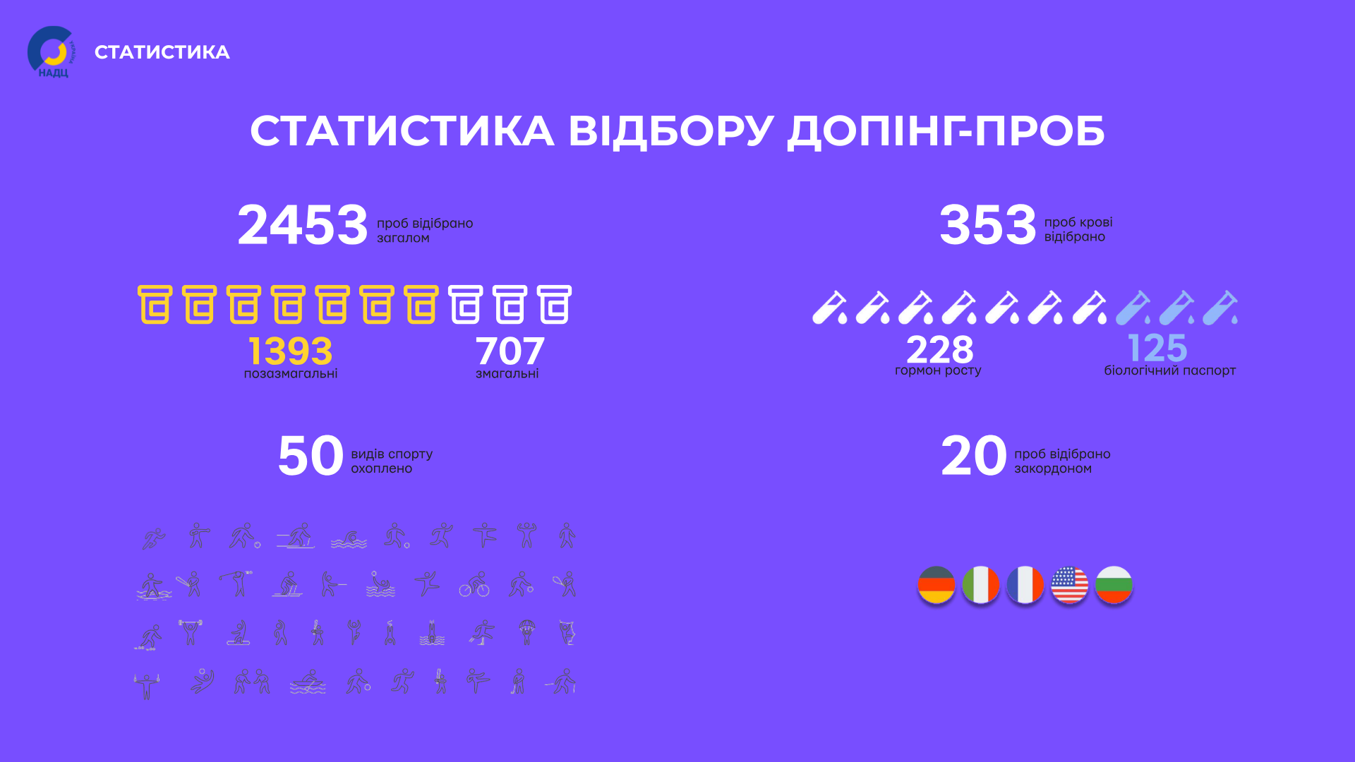 Загалом за звітний період відібрано 2453 допінг-проби, з яких 1393 — позазмагальні та 707 — змагальні.